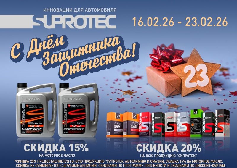 Итак, с 17 по 23 февраля 2026 года во всех фирменных магазинах компании (представительствах): в Санкт-Петербурге, Москве, Казани, Екатеринбурге, Челябинске, Новосибирске, Краснодаре каждый покупатель получит скидку 20% на трибосоставы, автохимию и смазки и 15% - на моторное масло Suprotec.