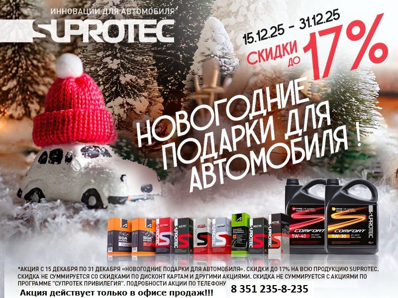 «Супротек» объявляет новогоднюю акцию «Подарки для автомобиля». Во всех фирменных магазинах «Супротек» в крупнейших городах страны – скидки на продукцию «Супротек» до 17% с 19 по 31 декабря 2025 года.