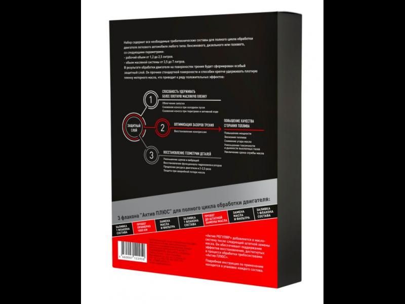 Набор "Актив Плюс" (новый состав) содержит все необходимое количество триботехнических составов для полного цикла обработки бензинового, дизельного и газового двигателя легкового автомобиля с пробегом более 50 000 километров.